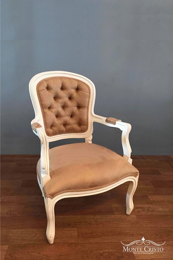 Poltrona Luís Felipe cód. 01 branca provençal com tecido, também disponível em outras cores. Com estrutura reforçada que garante maior estabilidade e segurança, a poltrona Luís Felipe é fabricada na madeira Jequitibá, tem capitonê no encosto e recebe tratamento contra cupim além de seladora que a impermeabiliza.