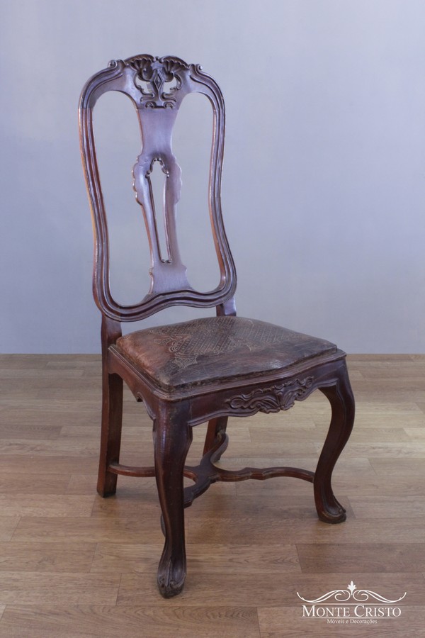 Cadeira Dom José em Jacarandá com couro. Estrutura reforçada que garante maior estabilidade e segurança, a cadeira Dom José é fabricada na madeira nobre Jacarandá que recebe tratamento contra cupim além de seladora que a impermeabiliza, o acento em couro recebe entalha artesanal. A cadeira Dom José possui influência do rococó, com pernas finas e curvadas no estilo da cadeira Luís XV.