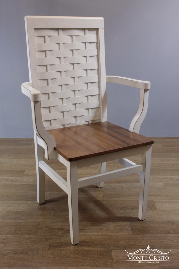 Cadeira Trança branca provençal com braço, também disponível em outras cores. Estrutura reforçada que garante maior estabilidade e segurança, a cadeira Trança é fabricada na madeira Jequitibá que recebe tratamento contra cupim além de seladora que a impermeabiliza.